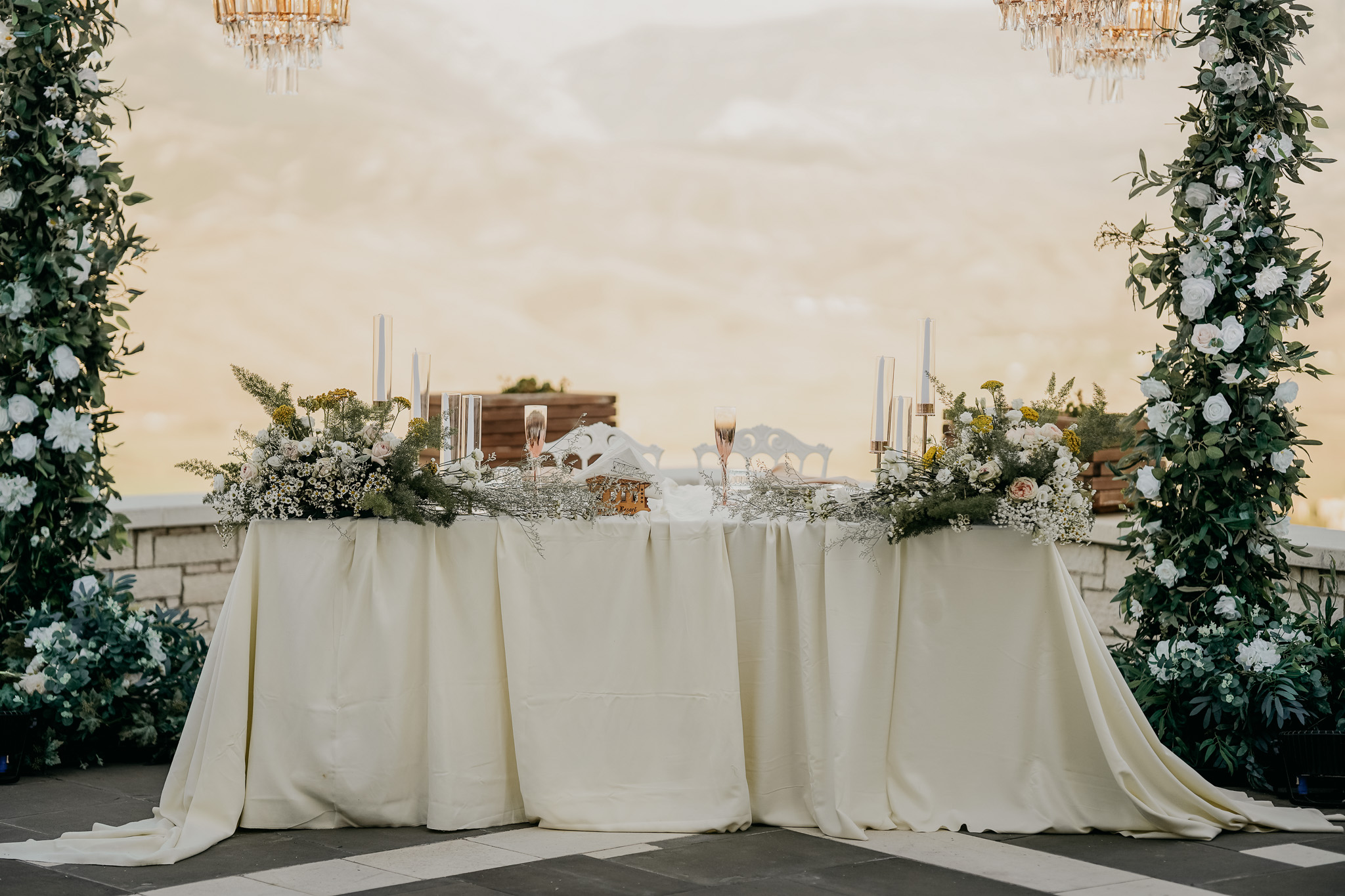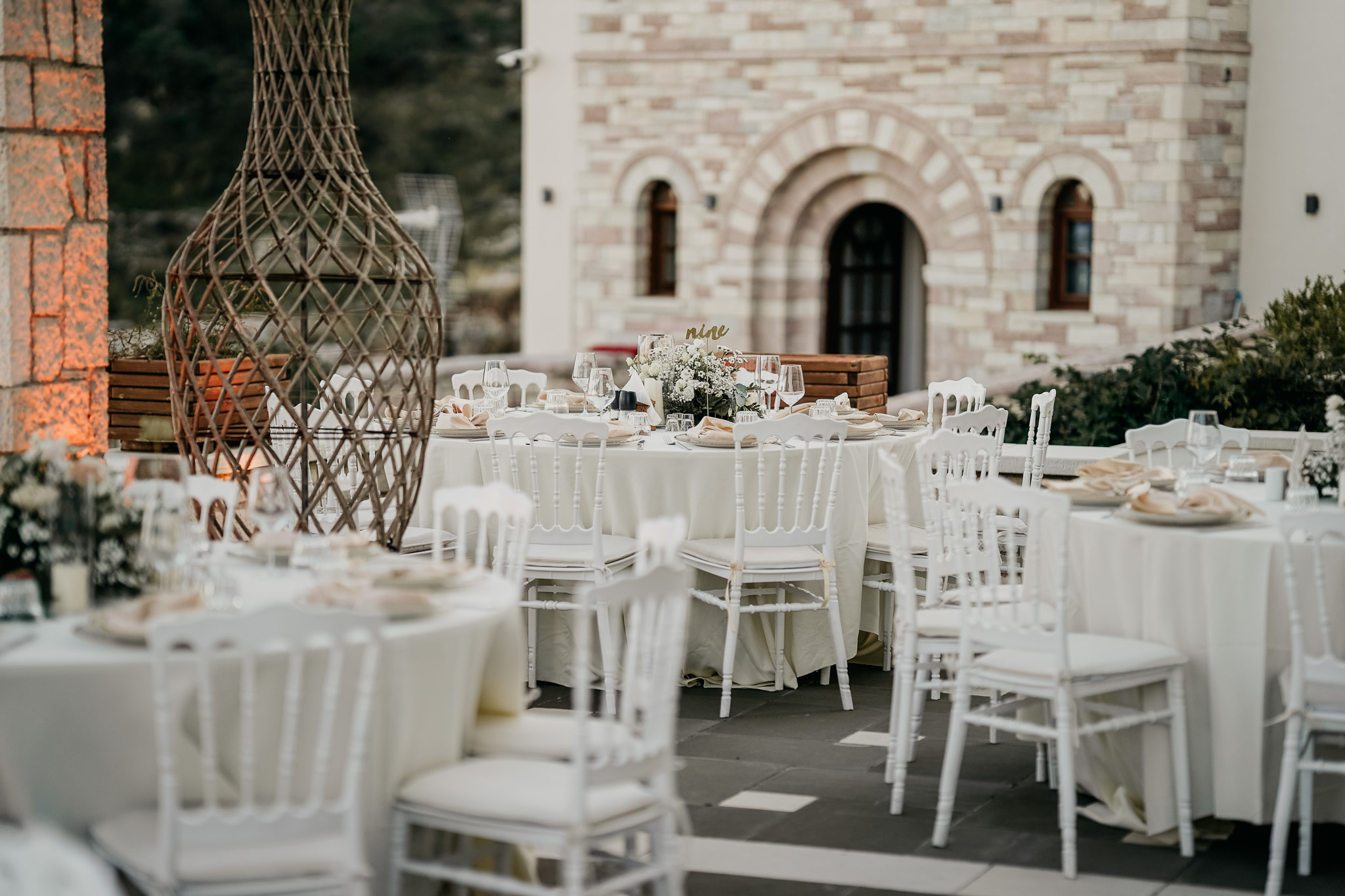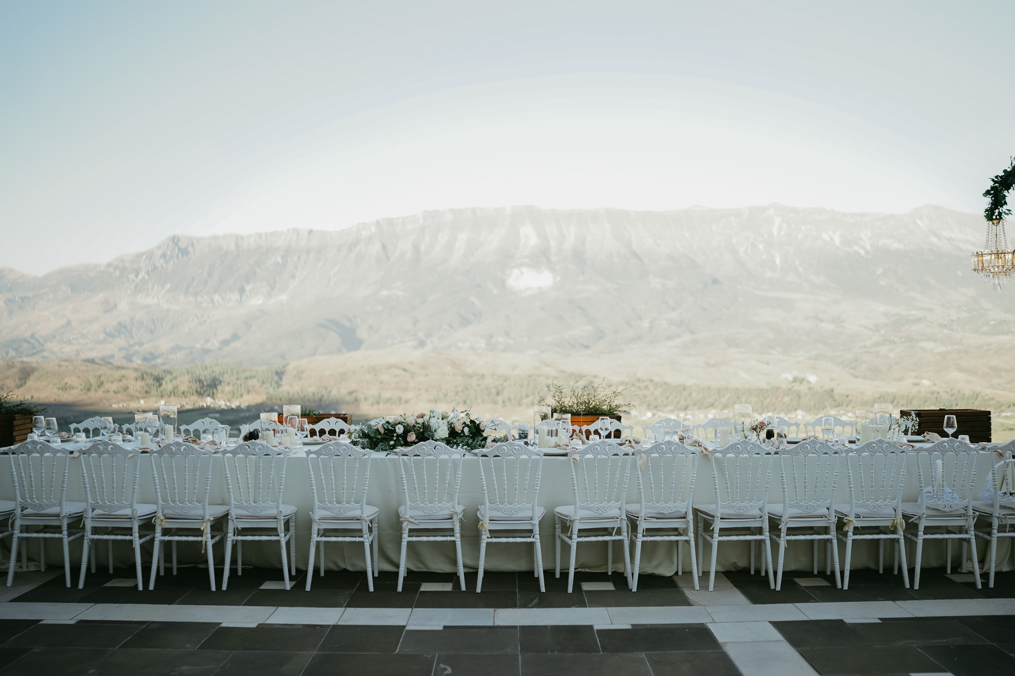 The wedding design was inspired by the architectural soul of Gjirokastër, carefully balancing historic character with modern luxury. Crisp white linens, elegant seating, and refined floral compositions were selected to contrast beautifully with the city’s signature stone textures. The layout was intentionally minimal and timeless, allowing the UNESCO-listed setting and panoramic views to define the visual identity of the celebration. This approach resonates strongly with couples seeking an authentic European destination wedding with a sophisticated, editorial aesthetic.
